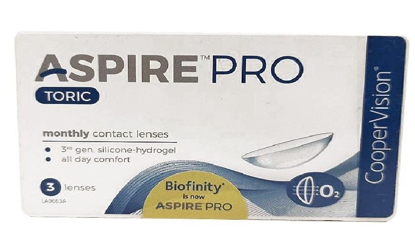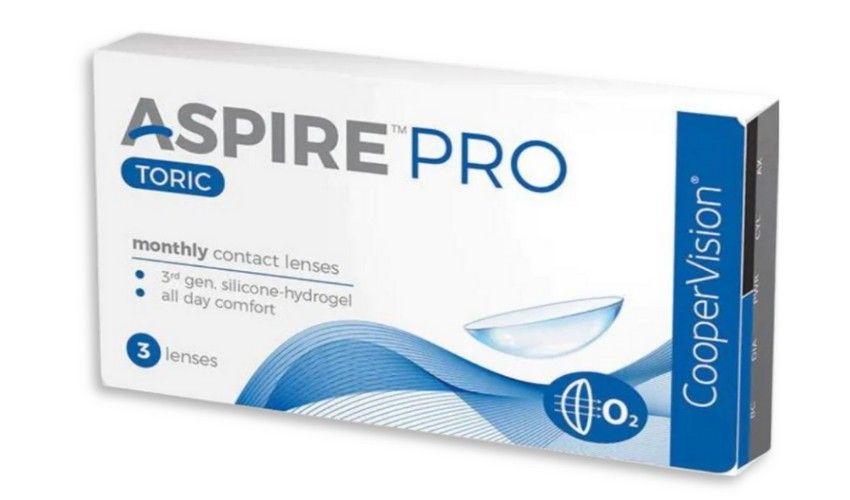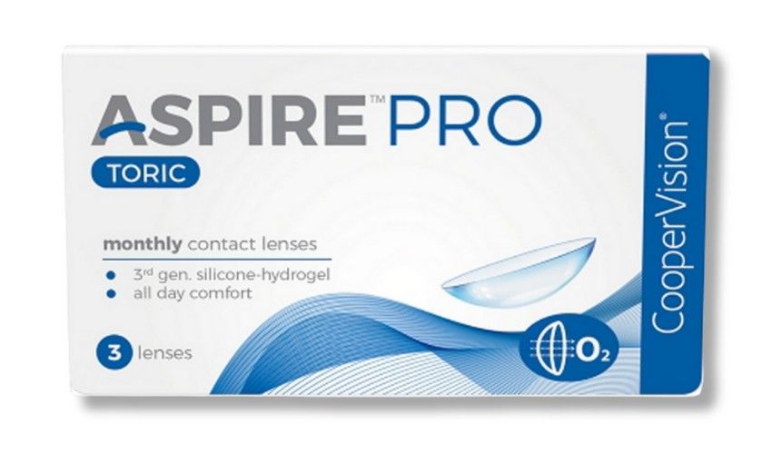 aspire pro toric monthly disposable contact lens is a 3rd generation silicone-hydrogel soft contact lens which offers great comfort and wearing experience due to its high oxygen permeability which allows plenty of oxygen to pass through your eyes. thus providing extraordinary visual comfort and stable fit for astigmatic patients.